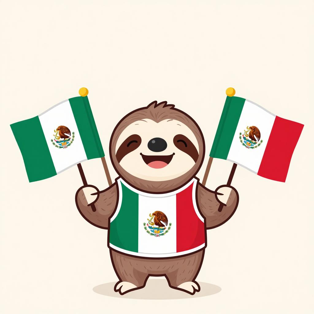 Illustration of a cheerful sloth holding two Mexican flags with green, white, and red vertical stripes and the national coat of arms in the center. The sloth is wearing a vest that features the Mexican flag colors and emblem. The background is simple beige.