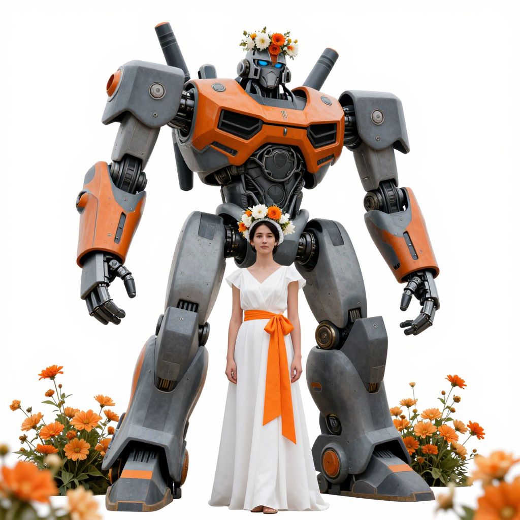 The image depicts a striking scene where a large, industrial robot, painted in shades of gray and orange, stands majestically against a white background. The robot's intricate mechanical components and joints are detailed with precision, giving it a robust and imposing presence. Atop the robot's head is a crown of white and orange flowers, adding a touch of elegance and contrast to its otherwise mechanical appearance. A woman, adorned in a flowing white dress with a vibrant orange sash, stands confidently beside the robot. Her dress is complemented by a white headpiece decorated with flowers, matching the crown on the robot's head. The woman's posture and the way she holds the robot's arm suggest a sense of partnership or companionship. Surrounding them are clusters of orange flowers, their petals adding a soft, natural element to the otherwise mechanical scene. The overall composition is balanced, with the robot and the woman positioned centrally, creating a harmonious visual narrative.