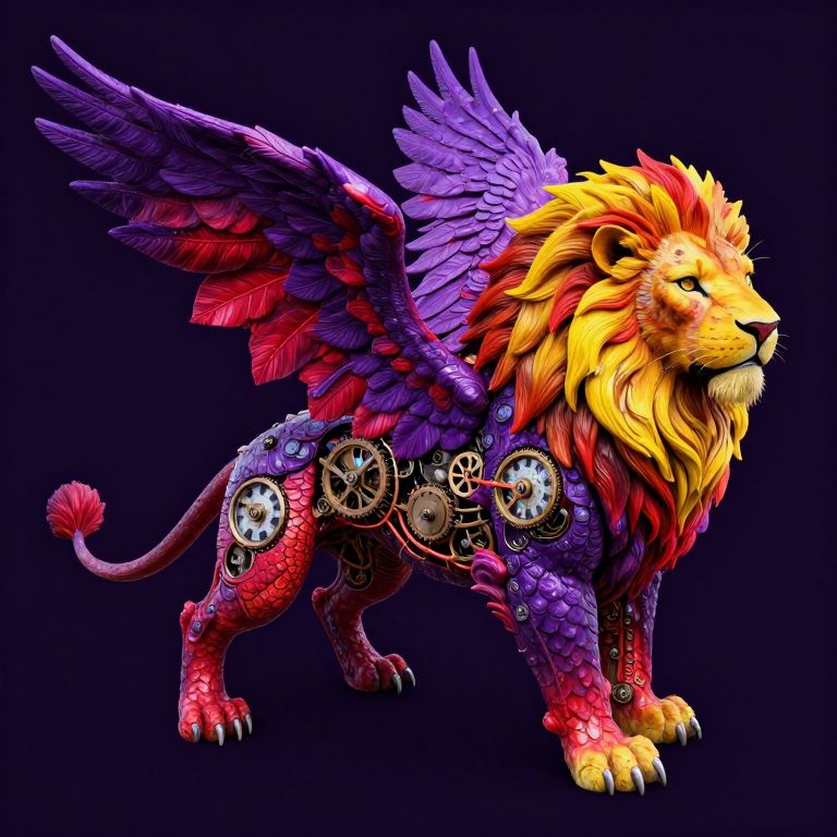 Digital artwork of a vibrant, mythical lion with purple wings, red and yellow mane, and metallic gears on its body, set against a dark blue background