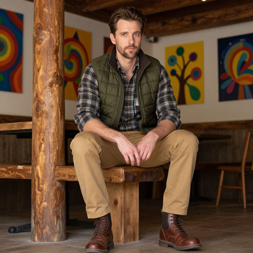 A man, rugged quilted vest in olive green, soft flannel shirt in plaid, tan khakis, brown leather boots, rustic wooden beams, vibrant art installations, cozy seating areas, camera obscura style, thoughtful expressionMan has masculine face and piercing eyes