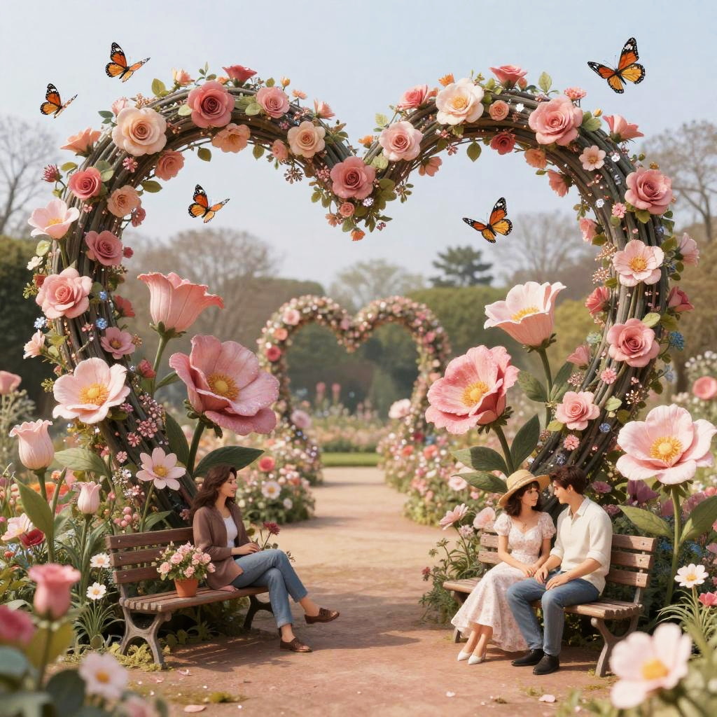 Realistic photo.Magical 14th of February garden filled with giant heart-shaped flowers and glittering pink vines, with butterflies flitting around and couples sitting on benches, in a soft impressionist illustration, romantic and enchanted setting realistic photo