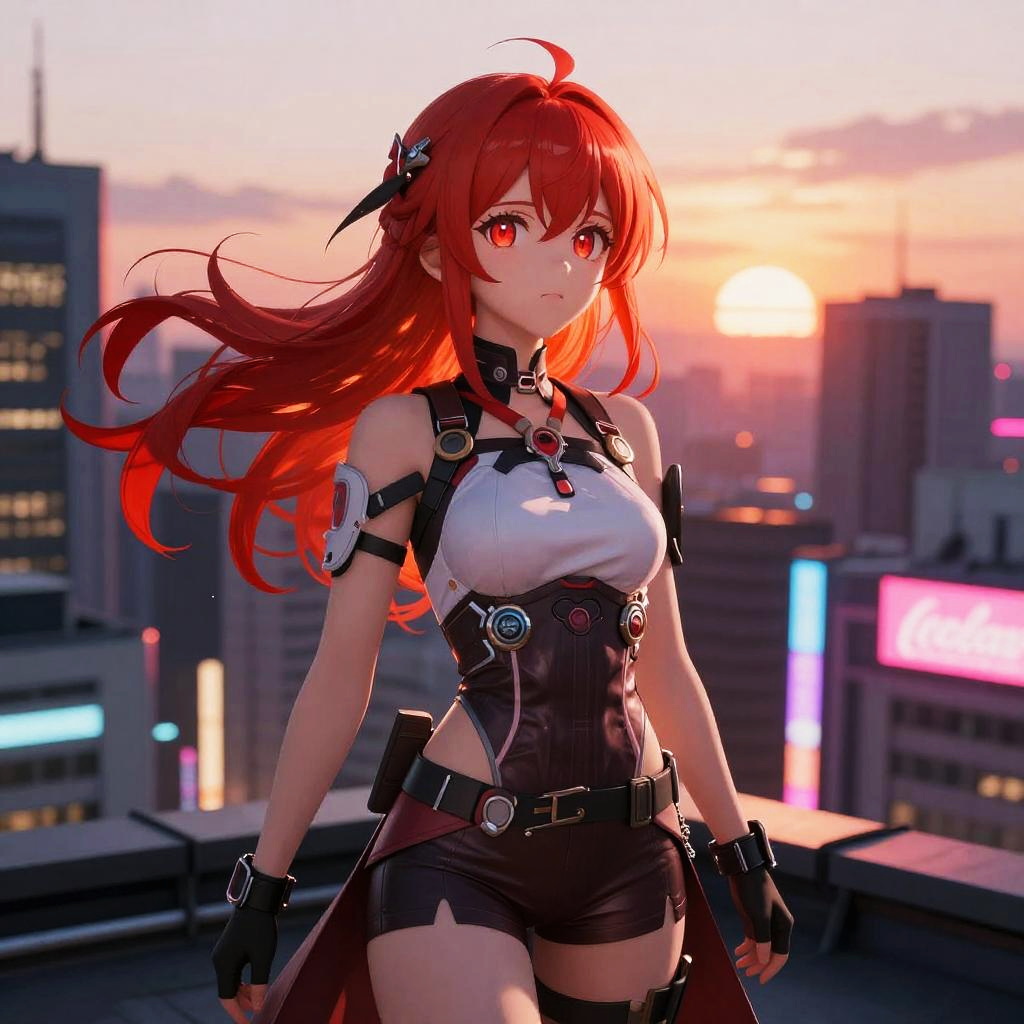 Anime girl with red hair and red eyes sitting on a futuristic motorcycle, night cityscape with bright lights in the background, her hair flowing in the wind, cool and edgy expression, highly detailed anime illustration focusing on action and style.