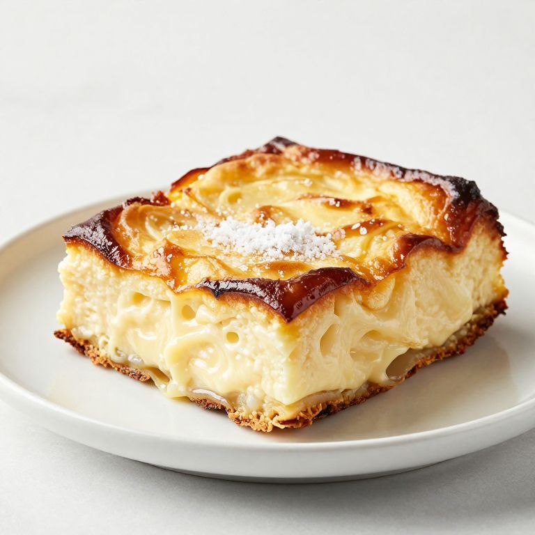 Photograph of a single, golden-brown, square cheesecake slice with a caramelized, slightly crispy top crust and creamy, pale yellow interior. The cheesecake is dusted with a light sprinkle of powdered sugar. It is placed on a plain, white ceramic plate, which sits on a clean, white surface. The lighting is bright, highlighting the cheesecake's texture and rich, warm colors, with shadows adding depth. The background is completely white, emphasizing the cheesecake as the main subject. The image has a high contrast and sharp focus, showcasing the dessert's detailed texture.