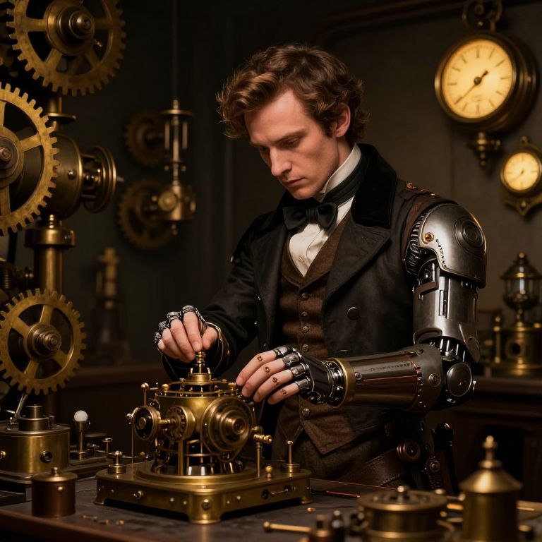 A portrait of Marini in a steampunk-inspired workshop filled with intricate gears, brass machinery, and glowing dials, dressed in Victorian-era attire mixed with cybernetic enhancements, working thoughtfully on an elaborate mechanical device.
