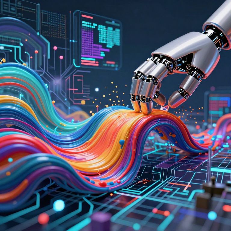 AI art diffusion process depicted as waves of vivid paint flowing from a robotic hand, merging with pixelated interfaces and glowing circuit grids, dynamic interplay between organic creativity and artificial intelligence, vibrant, detailed, concept art style.