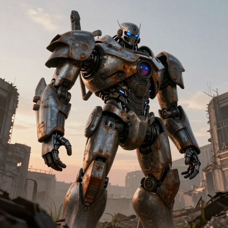 Robotic Guardian in Dystopian Wasteland