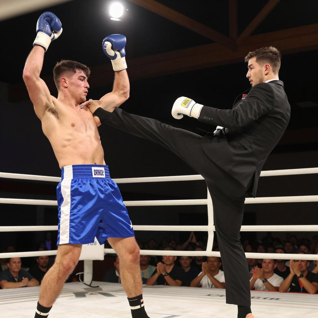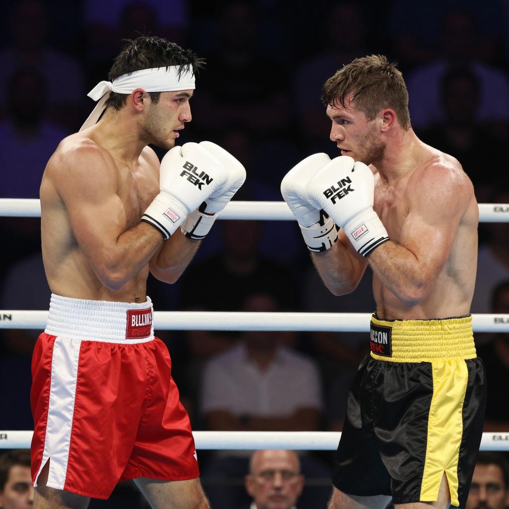 Two muscular men in a boxing ring. The left man, with dark hair, red shorts, and a white headband, raises his fists. The right man, with brown hair, black and yellow shorts, and an intense expression, raises his hands in a defensive gesture. Both are shirtless. Dark, blurry crowd in the background.