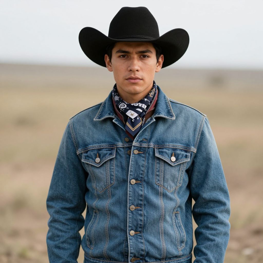 Photograph of a young man with olive skin, wearing a black cowboy hat, blue denim jacket, and patterned bandana, standing in a blurred