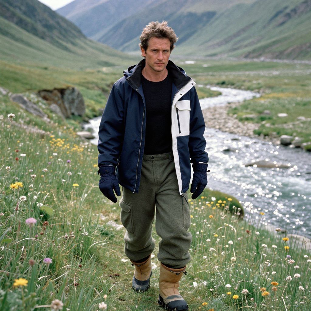 A photograph of a rugged, middle-aged man with curly brown hair and a serious expression, walking along a grassy path beside a shimmering river. He wears a black jacket with white stripes, a black shirt, olive green cargo pants, and tan hiking boots. His hands are covered in black gloves. The background features lush green hills, a sparkling river, and a field of wildflowers, including yellow and pink blooms. The sky is overcast, and the landscape is vibrant with natural colors.