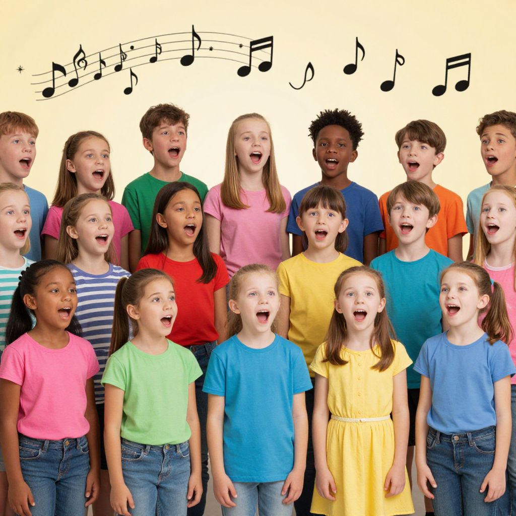 Photograph of diverse, cheerful children singing, mouths open, wearing colorful clothes, musical notes above, white background, front row standing, back row standing