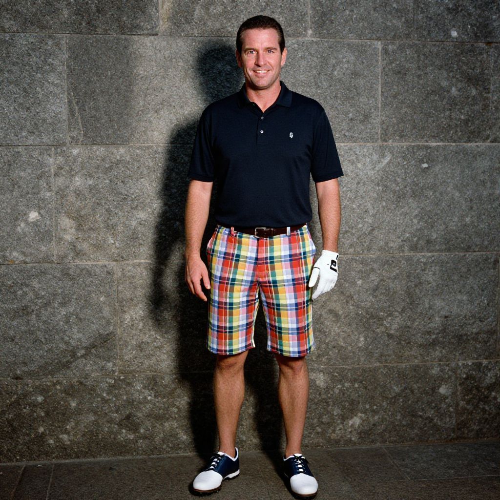 Photograph of a light-skinned man with short brown hair and a trimmed beard, standing against a dark, textured stone wall. He is wearing a black polo shirt, colorful red, yellow, and white plaid shorts, white sneakers with black accents, and white golf gloves. The man is smiling slightly and looking at the camera. The lighting is bright, casting a clear shadow on the wall behind him, emphasizing the stone's texture. The setting appears to be outdoors, possibly near a golf course.