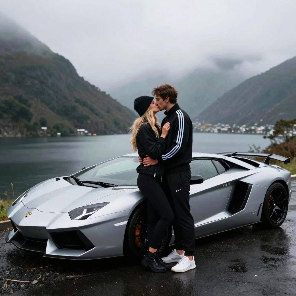 A dramatic photo shows a couple kissing beside a sleek, silver Lamborghini on a rainy, overcast day. The woman with long blonde hair wears a black jacket and hat, while the man in a black Adidas tracksuit hugs her. The car is parked on a gravel surface with a misty mountain and lake in the background. The scene is moody and romantic.