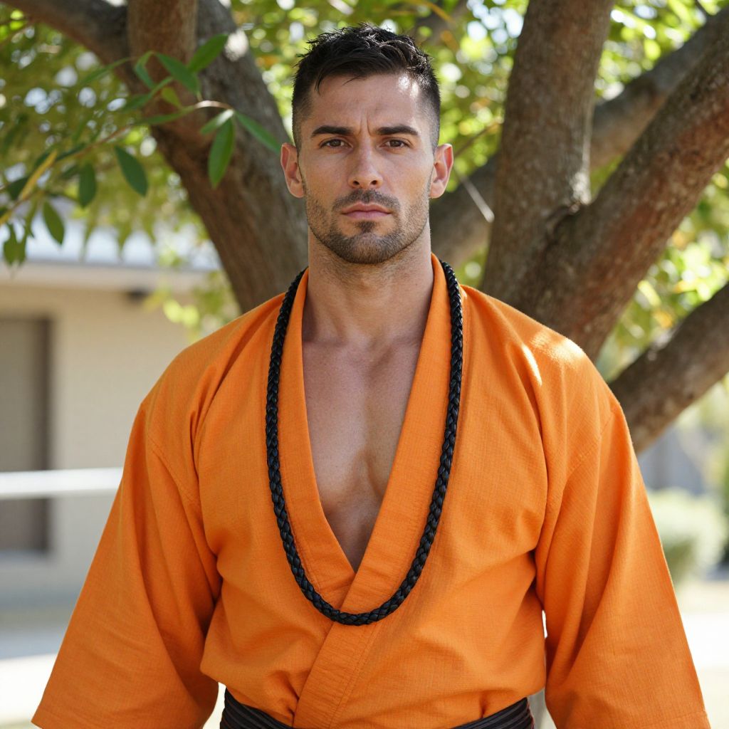 A man wearing an orange kimono with a black braided necklace around his neck, standing in front of a tree with green leaves and a building in the background. The man has a muscular build, a strong jawline, and a confident expression, exuding a sense of authority and calmness. The scene is set in a natural, serene environment with sunlight filtering through the tree leaves, creating a warm, inviting atmosphere.