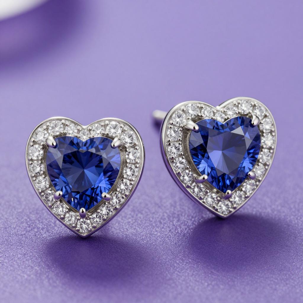 Extreme close-up of elegant white gold stud earrings featuring heart-shaped blue sapphire gemstones surrounded by a halo of small white diamonds. The earrings are set against a soft purple background, highlighting their sparkling high jewelry style and intricate design.