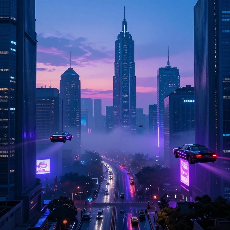 Photograph of a neon-lit, futuristic cityscape at dusk. Tall skyscrapers with illuminated windows and spires dominate the scene, bathed in blue and purple hues. A misty fog partially obscures the central buildings. Cars with bright headlights and taillights drive on a busy street below, flanked by vibrant billboards. The sky transitions from pink to blue, adding a gradient effect. The image has a high-contrast, digital art style, emphasizing the city's modern and dynamic atmosphere.