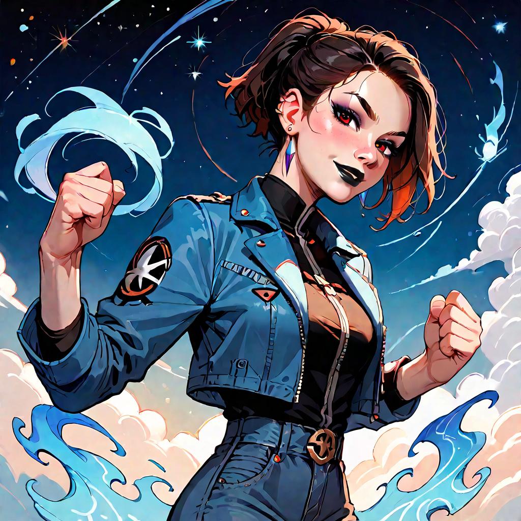 Digital illustration of a confident young woman with short brown hair in a ponytail and black lipstick. She wears a blue cropped leather jacket with a star emblem on the sleeve, a black top with white wrappings, and high-waisted pants. She has ear piercings and brown eyes with a smug expression, standing with clenched fists surrounded by swirling blue magical energy, set against a starry space-themed background with clouds.