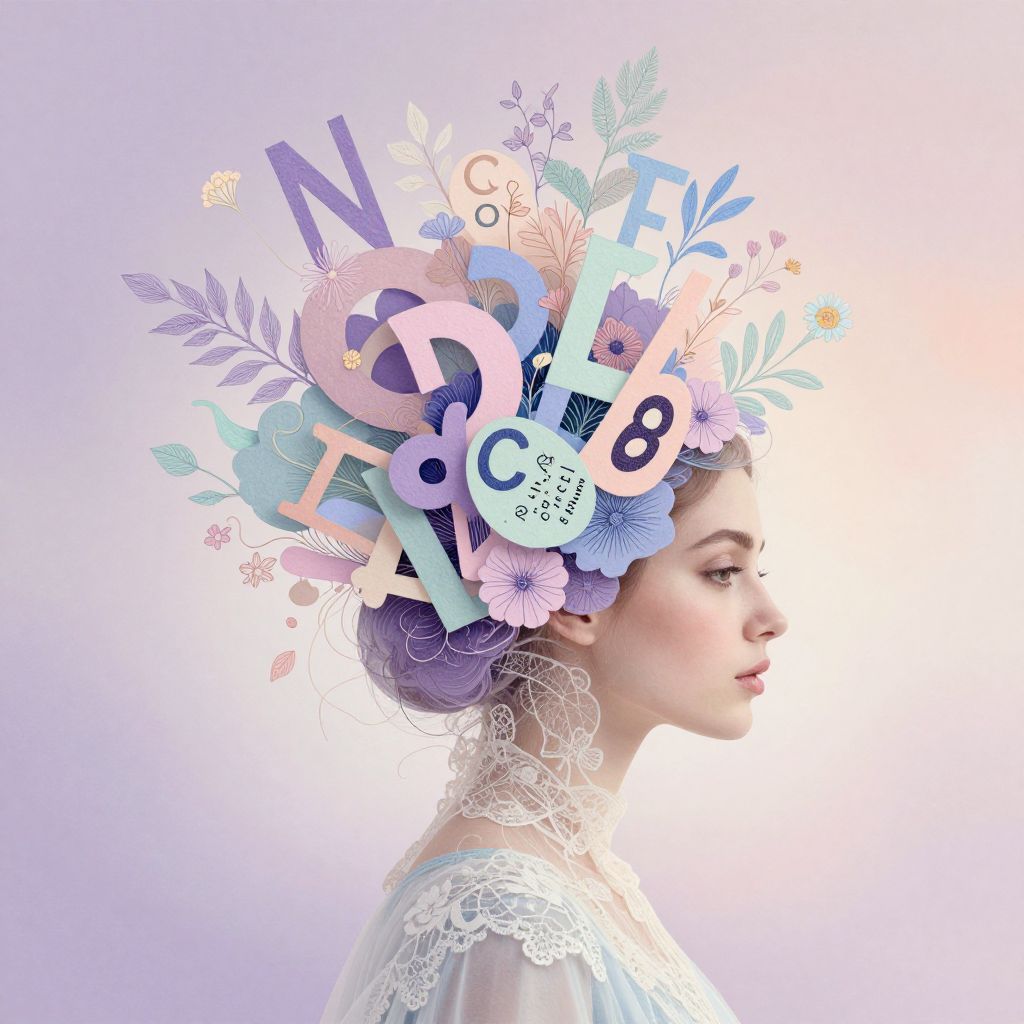 In a dream of letters and lace, surreal beauty weaves through color and line, A surreal side profile of a stunning woman adorned with a fantastical native headdress that fuses typography, whimsical artistry, and surreal elegance, The headdress is a breathtaking creation inspired by Herb Lubalin's expressive typographic forms, NICOLETTA CECCOLI's dreamlike and delicate aesthetics, and Amano Yoshiki's ethereal and intricate linework, Letters, symbols, and flowing type meld seamlessly into soft organic shapes, intertwining with fluid botanical motifs and otherworldly elements that radiate elegance and mystery, The composition features tender, dreamlike hues—gentle pastels of lavender, blush pink, sky blue, mint green, and soft creams—crafted with textures reminiscent of crayons, pastels, and colored pencils, lending the piece a tactile, handcrafted quality, Delicate gradients and subtle layering evoke a fantastical yet soft and inviting atmosphere, The woman's silhouette is bathed in gentle, fashion-editorial lighting that highlights her refined features while adding a soft glow to the headdress's intricate details, The background is an abstract gradient of muted lavender and peach, creating a serene and otherworldly ambiance that enhances the surreal, editorial fusion of art, fashion, and design