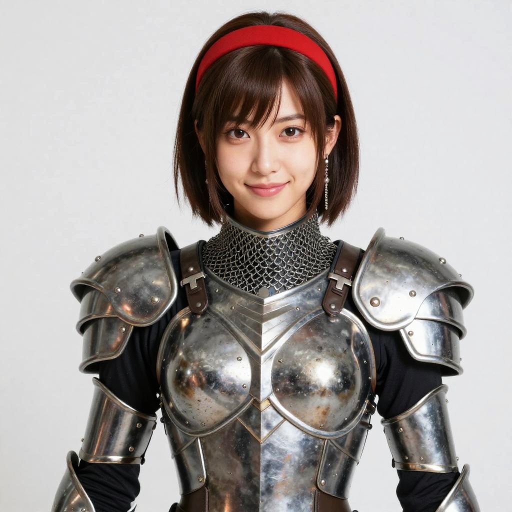 Ff7r style, 1girl, solo, armor, jewelry, earrings, brown hair, shoulder armor, headband, brown eyes, red headband, looking at viewer, chainmail, lips, breastplate, upper body, pauldrons, bodysuit, realistic, boobplate, short hair, smile