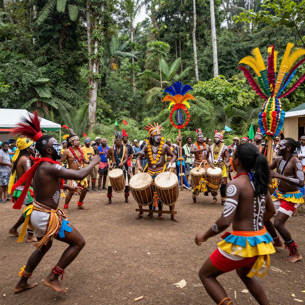 Photograph of vibrant African drummers in colorful feathered headdresses and traditional attire, performing outdoors in a lush, tropical forest setting.