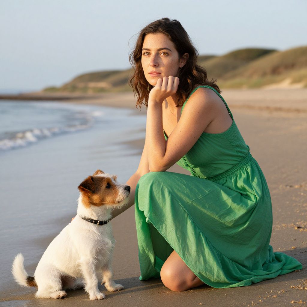 A dress-clad woman kneels on the wet sand by the seashore, her bright green dress slightly damp from the sea, her face thoughtful with a natural freckled complexion and warm hazel eyes; a small, friendly terrier dog sits beside her, ears perked, looking up at her; the setting is a quiet, peaceful beach at golden hour with soft dunes and a gentle breeze