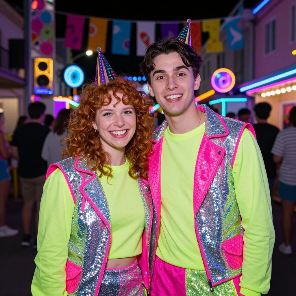 A cheerful couple in their late 20s, one with curly red hair and a mischievous smile, and the other with straight dark hair and a kind, open face, dressed in matching neon party outfit costumes with shimmering silver and electric pink details, standing in a neon-drenched street festival with vibrant banners and sound systems blasting music.