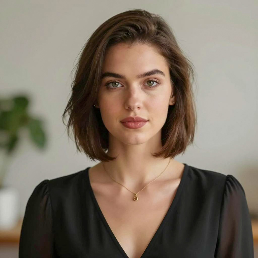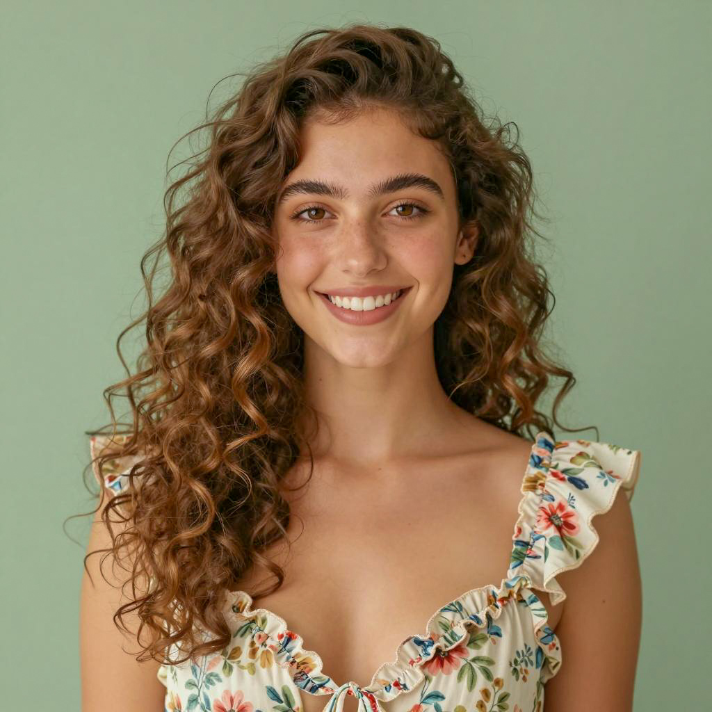 Portrait of a young woman with long brown hair and brown eyes wearing a navy blue floral print dress, standing on a boat with a calm water body and forested shoreline in the background.