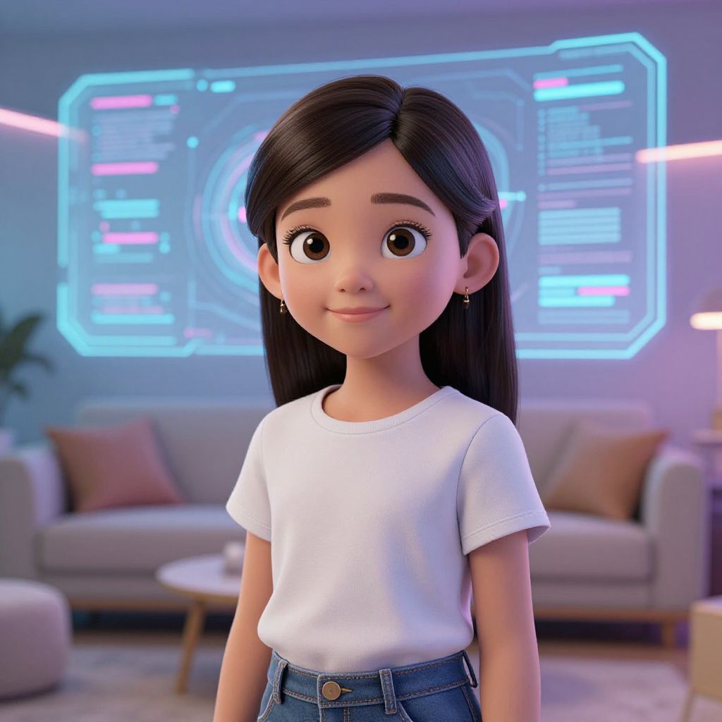 A tween girl AI concept illustrating a young girl with expressive eyes and a friendly smile, standing in a futuristic living room with holographic screens and soft neon lighting, blending real-world childhood with digital intelligence. The girl's appearance is age-appropriate, gentle, and digitally enhanced to reflect artificial intelligence traits like calm focus and intuitive expression.