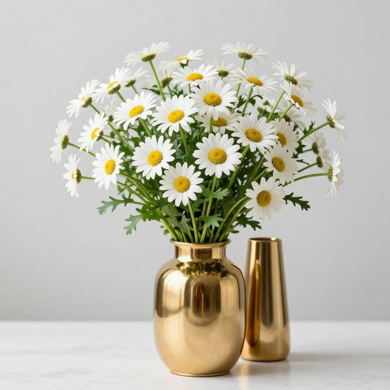 Photograph of a white daisy bouquet in a shiny, gold, spherical vase with a matching, taller, gold vase beside it. The daisies have bright white petals and yellow centers, with green leaves and stems visible. The background is a plain, light gray, creating a simple and clean aesthetic. The white surface beneath the vases adds contrast, highlighting the reflective gold and the fresh flowers. The image has a bright, natural light, emphasizing the vibrant colors and textures of the daisies and vases.