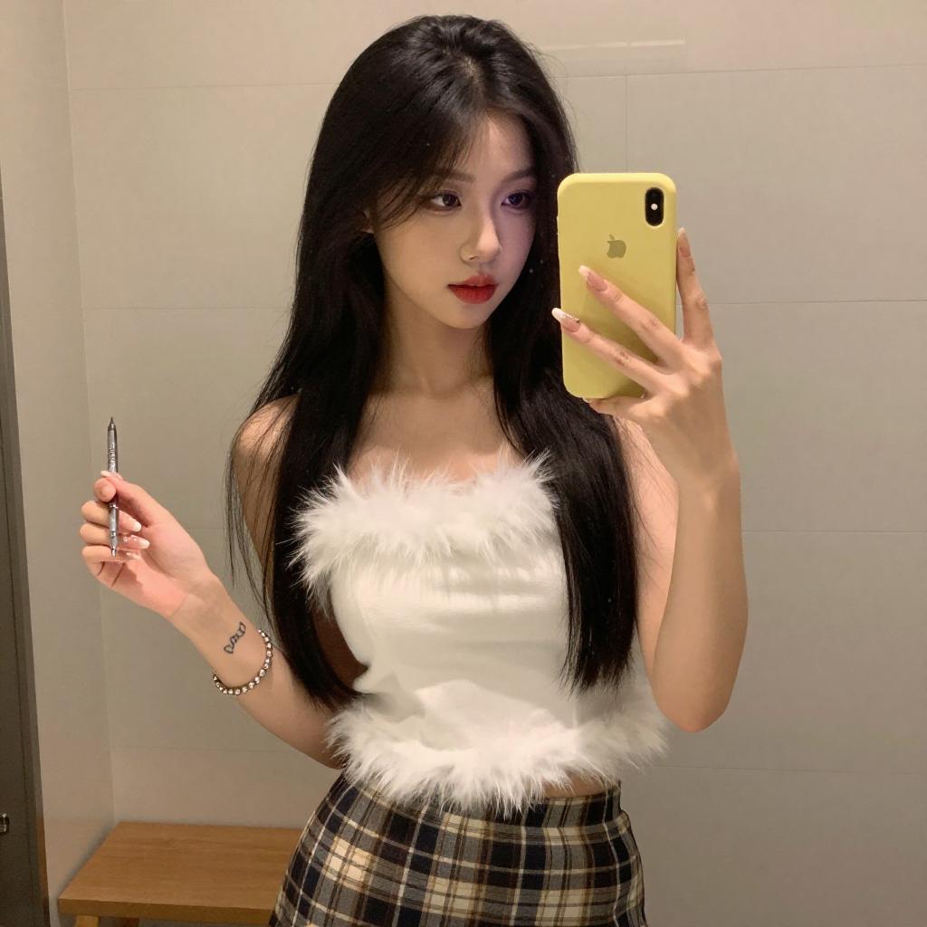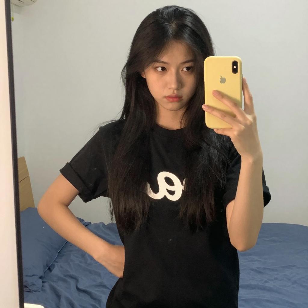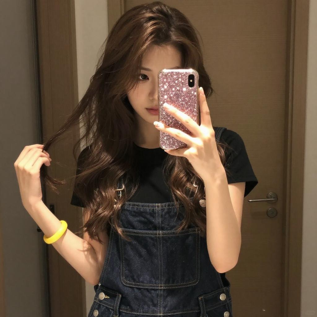 Photograph of an Asian woman with long black hair, wearing a white short-sleeve top and beige pants, taking a mirror selfie with a white smartphone. She has fair skin, red lipstick, and a black hair clip. The background features a brick wall on the left and a light-colored door on the right.