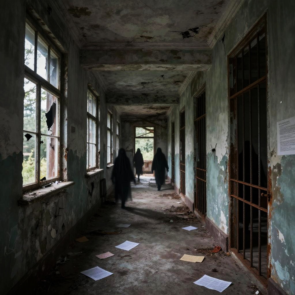 Spooky drawings of a derelict asylum with broken windows and rusted bars, shadows of ghostly figures lurking in corridors, peeling paint and scattered papers, surreal and haunting imagery with a muted color palette and sharp contrast highlights.