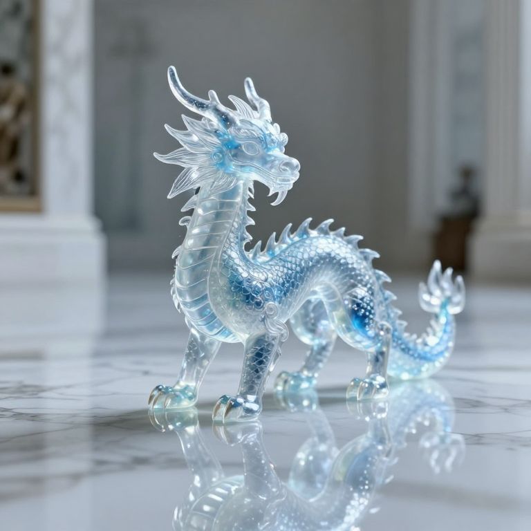 A translucent, crystalline dragon of ethereal blue hue stands poised upon a polished surface, its form shimmering with liquid light as it gazes into its perfect reflection in an endless, marble-clad hall.