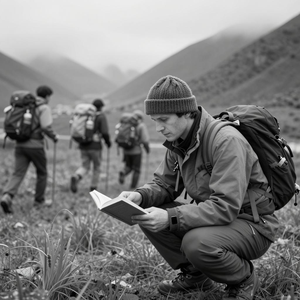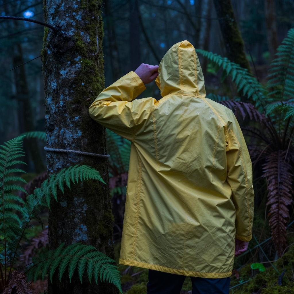 Group of five people standing around a campfire in a forest at night. One woman with long brown hair in a green jacket stands to the left. A man in a hat and jacket sits next to her. Another man with short brown hair, wearing a dark jacket, sits cross-legged in front of the fire. A person in a dark hooded jacket stands to the right, and a fourth person in a dark jacket stands beside them. Log firewood and camping gear are in the foreground. Trees with sparse leaves fill the background. Warm, dim lighting highlights the campfire.