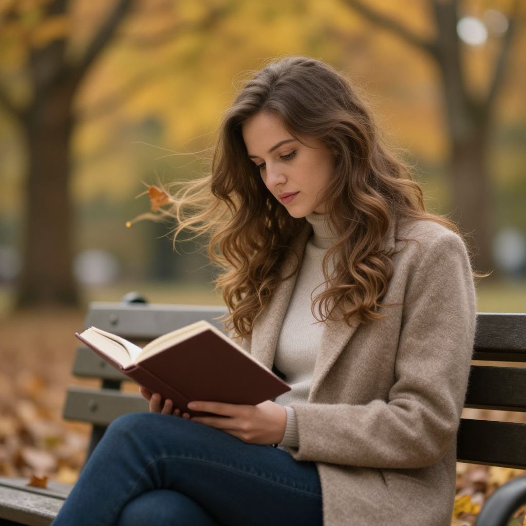 Woman with layered shoulder-length cut hairstyle sitting on a park bench reading a book, soft green trees in background, springtime atmosphere, gentle breeze, natural lighting, gentle expression, lifelike skin texture, MidJourney realistic tone.