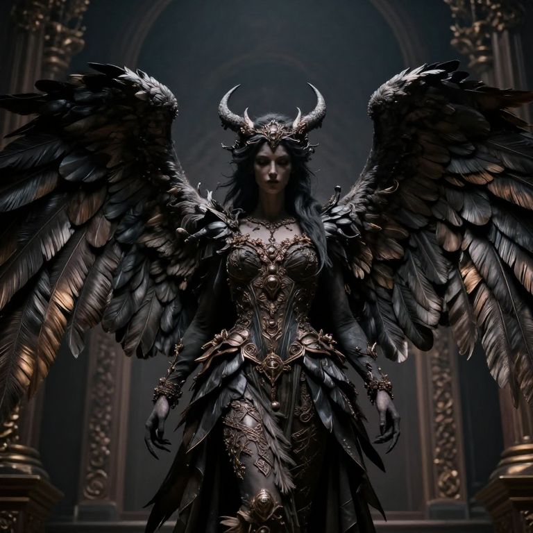 Digital artwork of a dark, imposing female demon with large black wings, intricate gold armor, and horns, standing in a dimly lit, ornate
