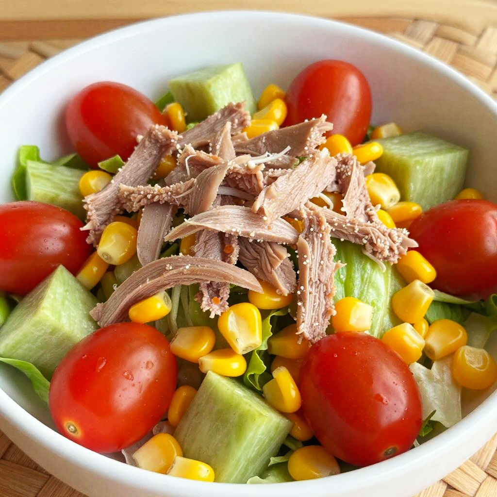 Close-up view of a vibrant garden salad in a white bowl featuring bright red cherry tomatoes, yellow corn kernels, green cucumber chunks, shredded lettuce, and a generous pile of shredded meat in the center. The salad is presented on a woven wooden surface, emphasizing freshness and color contrast.