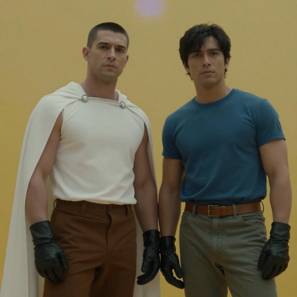Two muscular men with short black hair, intense expressions. Left wears white cape, brown pants, black gloves; right wears blue shirt, orange belt, green pants. Bright yellow background. Low-angle view. Arti BREAK MoviestillsDB.com., cinematic lighting, natural color grading, film grain, shallow depth of field, realistic textures, soft shadows, careful composition, moody atmosphere, subtle lens flare, 35mm film aesthetic