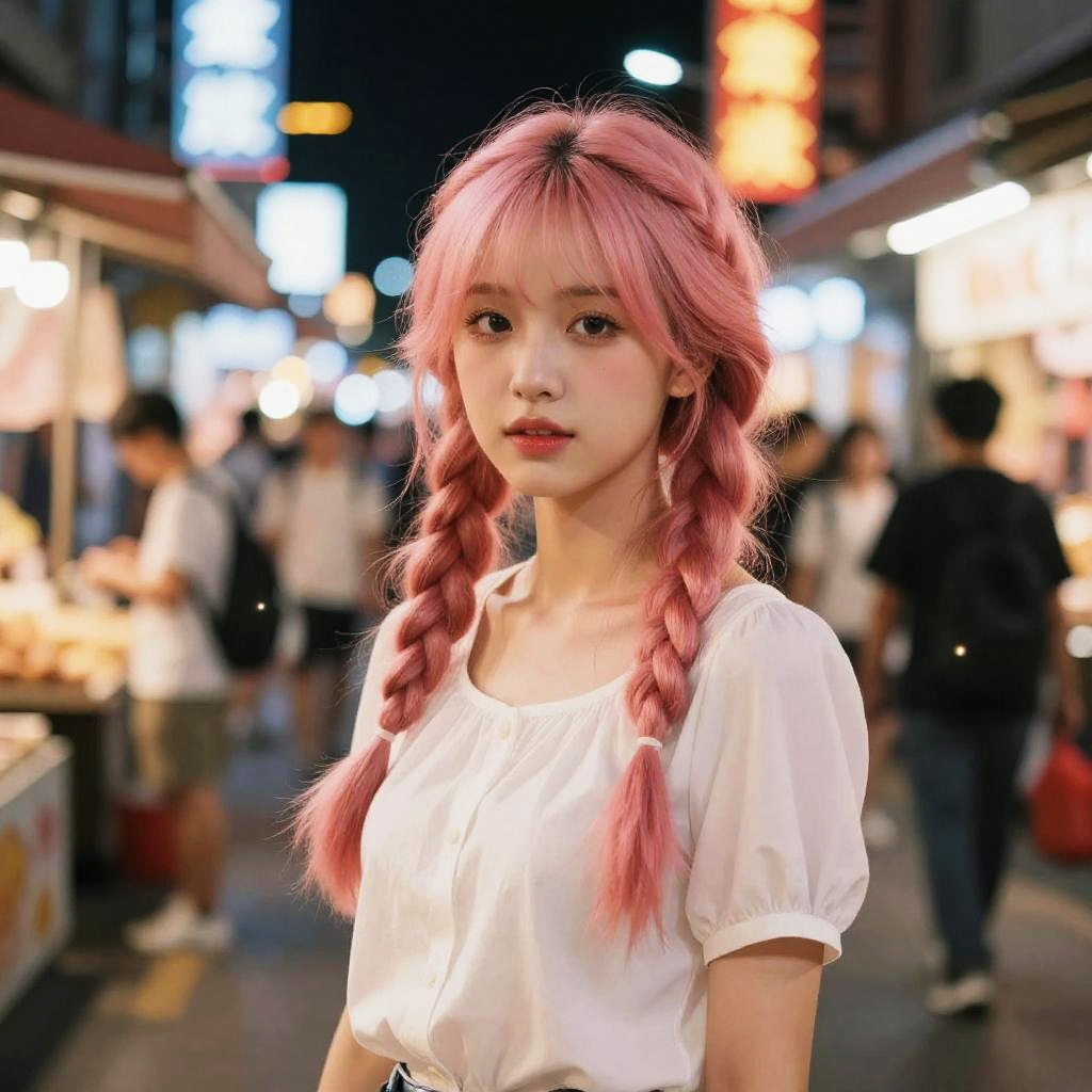 Young Woman with Pink Hair Sitting at Bus Stop