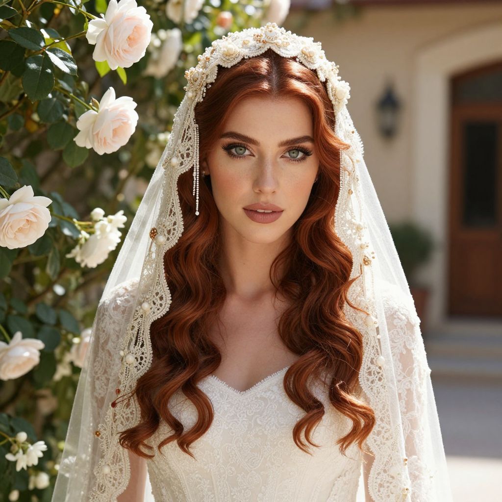 A natural light portrait of a bride in a traditional veil wedding costume, with long wavy auburn hair and green eyes, standing in a sunlit courtyard surrounded by blooming roses and jasmine, her bridal veil decorated with delicate lace and floral tassels