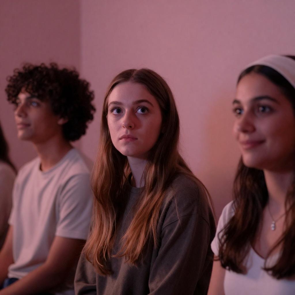 Photograph of three people in a dimly lit, pink-hued room. Central figure, a woman with long, light brown hair, looks to the left with wide eyes. Woman on the right, with dark hair and a white headband, smiles. Person on the left, partially visible, has curly hair and is turned away.