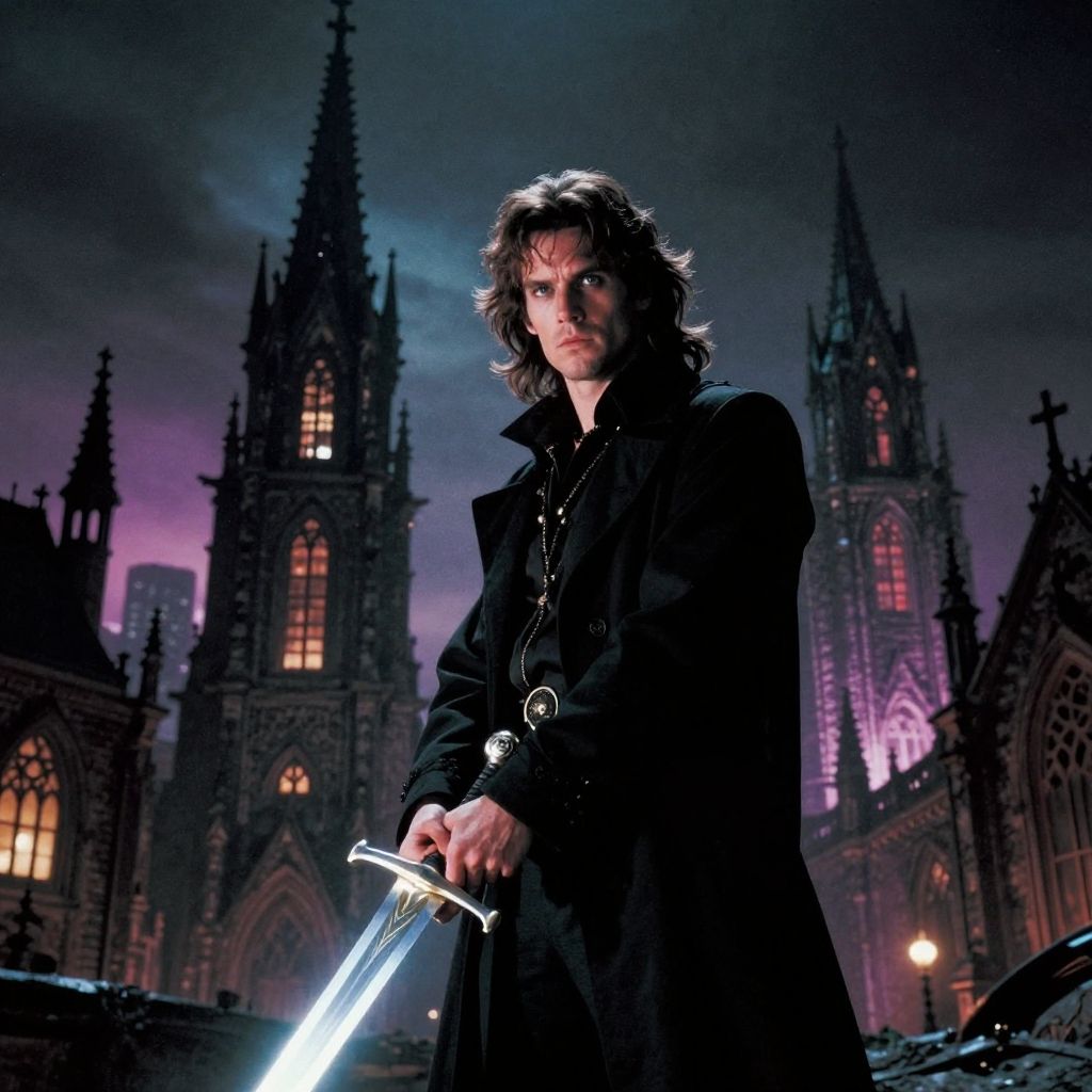 Dark fantasy movies 1980s vibe, brooding anti-hero wielding a glowing sword, gothic cityscape with towering spires, dramatic shadows and neon highlights, retro cinematic composition