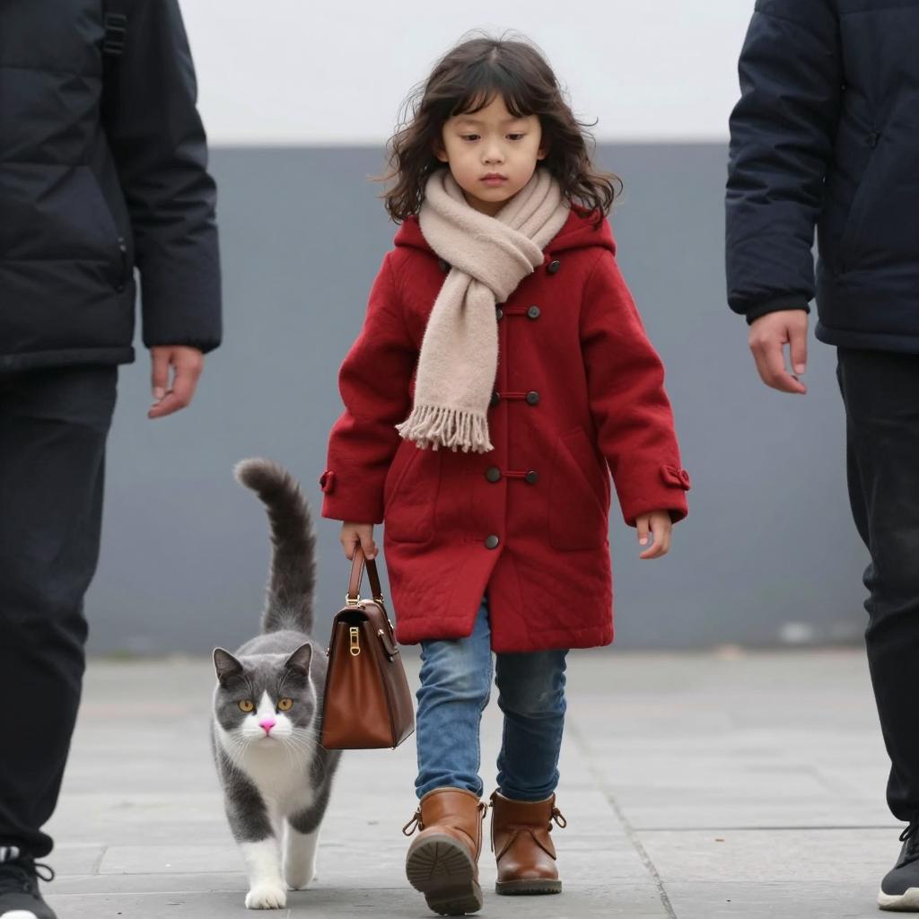 Photograph of a young girl with dark curly hair wearing a red coat, beige scarf, brown boots, and blue jeans. She carries a brown bag in her right hand. A gray and white cat with a pink nose walks beside her. The background is a ured gray and blue wall. The girl's expression is neutral, looking slightly downward. The cat's expression is alert, looking forward. The girl is walking forward, and the cat is slightly behind her. Two people.