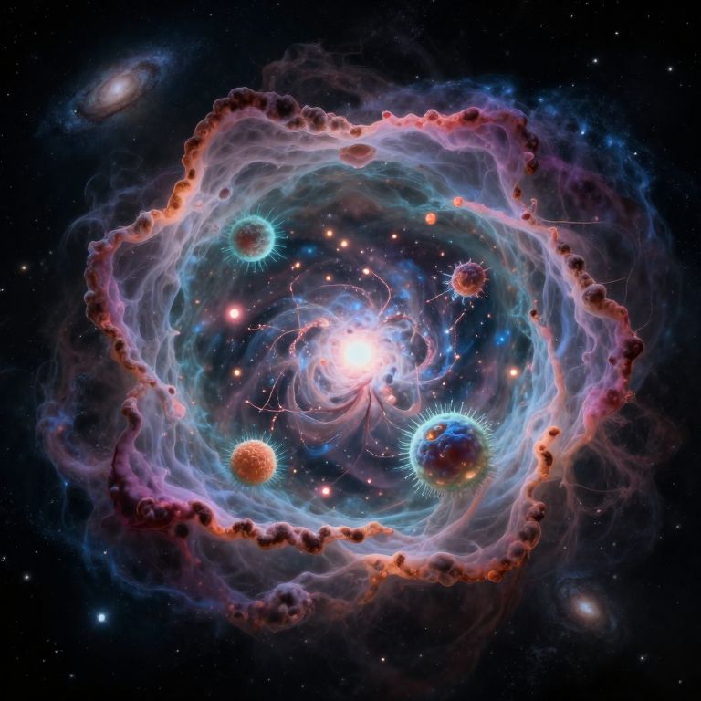 A captivating digital artwork depicting a celestial panorama with swirling galaxies and nebulae, reminiscent of intricate spiritual imagery. The scene is centered on an 'insect's perspective' within a radiant, bioluminescent blossom, revealing a stunning microscopic realm teeming with glowing microorganisms and luminescent spores. This innovative viewpoint evokes both astonishment for the intricacy of nature and a deep sense of amazement at the vastness of the universe, creating an emotional spectrum that enchants the viewer's imagination.