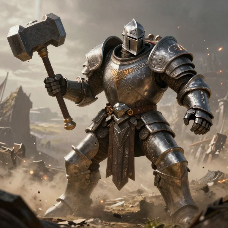 Juggernaut heavy armor knight charging through a war-torn landscape, enormous bulky steel armor with glowing runes etched across the plates, wielding a gigantic war hammer, dust and sparks flying, dramatic dynamic pose, medieval fantasy art style.