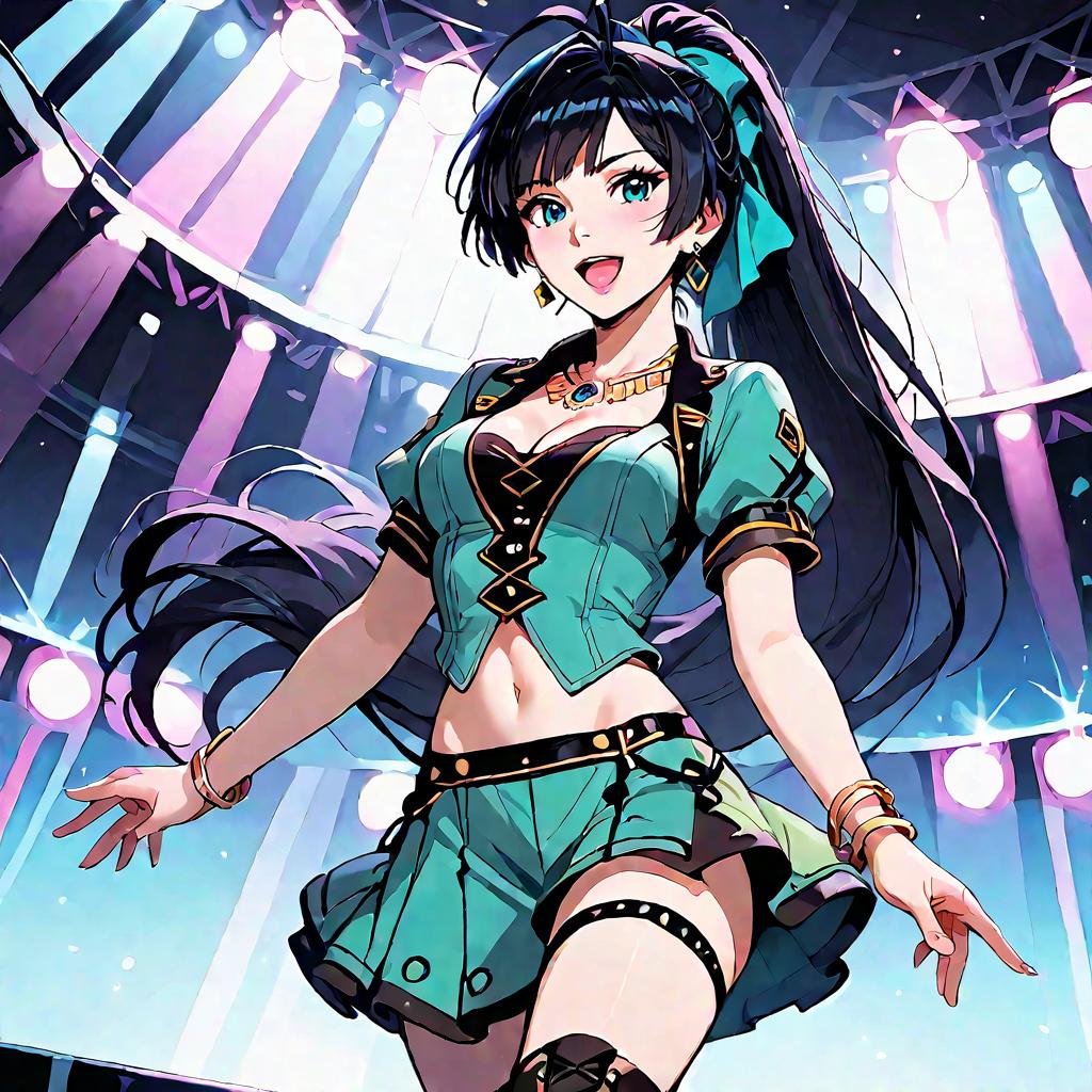 Score_9, score_8_up, score_7_up, source_anime, 1girl, solo, nsfw, idol concert, dancing on stage, cheerful, smile, open mouth, look at viewer, stage lights, large television, pillar, very long hair, black hair, ponytail, antenna hair, bangs, hair ribbon, blue eyes, medium breasts, fang, idol clothes, green dress, short sleeves, cleavage, midriff, navel, miniskirt, thigh strap, boots, necklace, bracelet, earrings