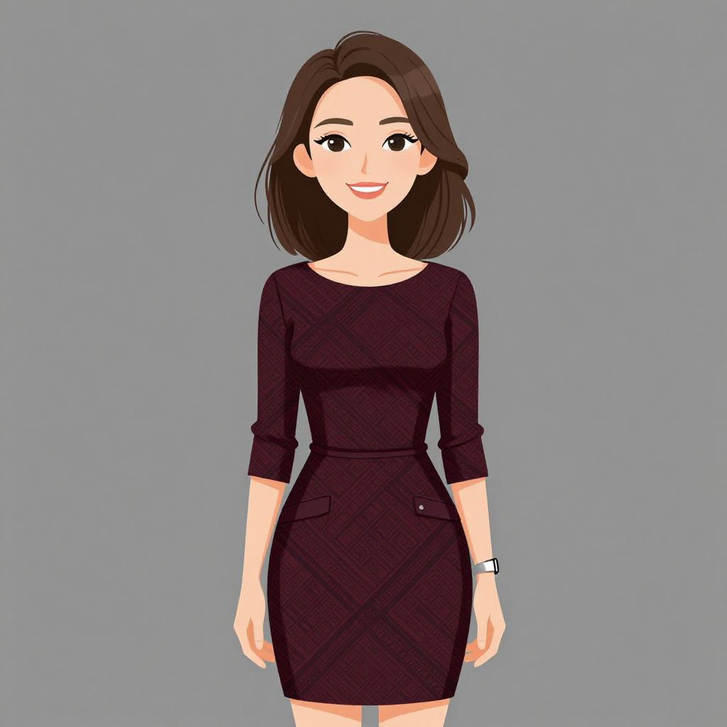 Woman with pretty face and pretty hair. smiling Woman, business chic, tailored pantsuit in taupe, slim fit, single-breasted blazer with notched lapels, two-button closure, straight-leg trousers, black crop top with a plunging neckline, black pointed-toe high heels, delicate gold necklace, minimal makeup, shoulder-length hair styled straight, studio background. --sref 1467