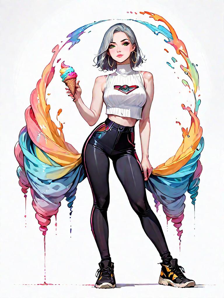 Illustration of a young woman in contemporary street style wearing a high-neck sleeveless white crop top with a colorful ice cream cone print paired with glossy high-waisted black leggings and black sneakers. She has short silver hair, silver hoop earrings, and holds a rainbow-colored ice cream cone in one hand with vibrant multi-colored abstract paint swirls surrounding her on a white background.