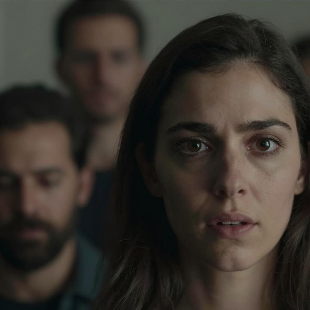 A white woman with light brown hair, wearing a blue top with a white collar. She has light skin, blue eyes, and a concerned expression. Her lips are slightly parted. Background is blurred with wooden and dark elements. She is centered, facing slightly to the right.