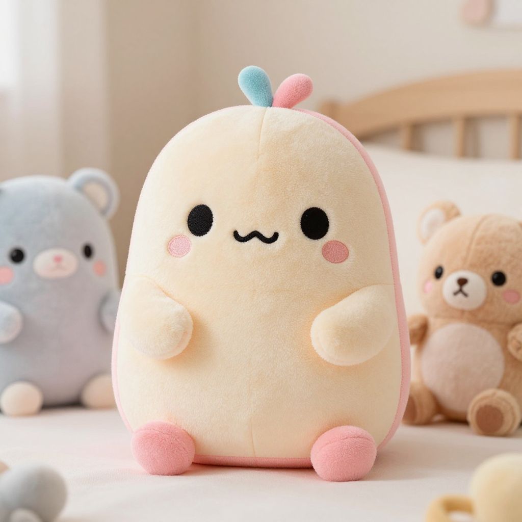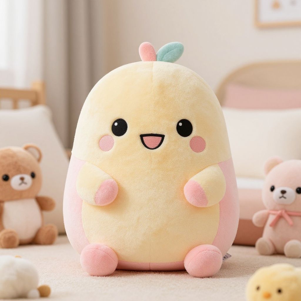 Squishmallow jyri plush toy sitting in a cozy child's bedroom with pastel colors, soft lighting, surrounded by other cute stuffed animals, ultra soft texture, high detail