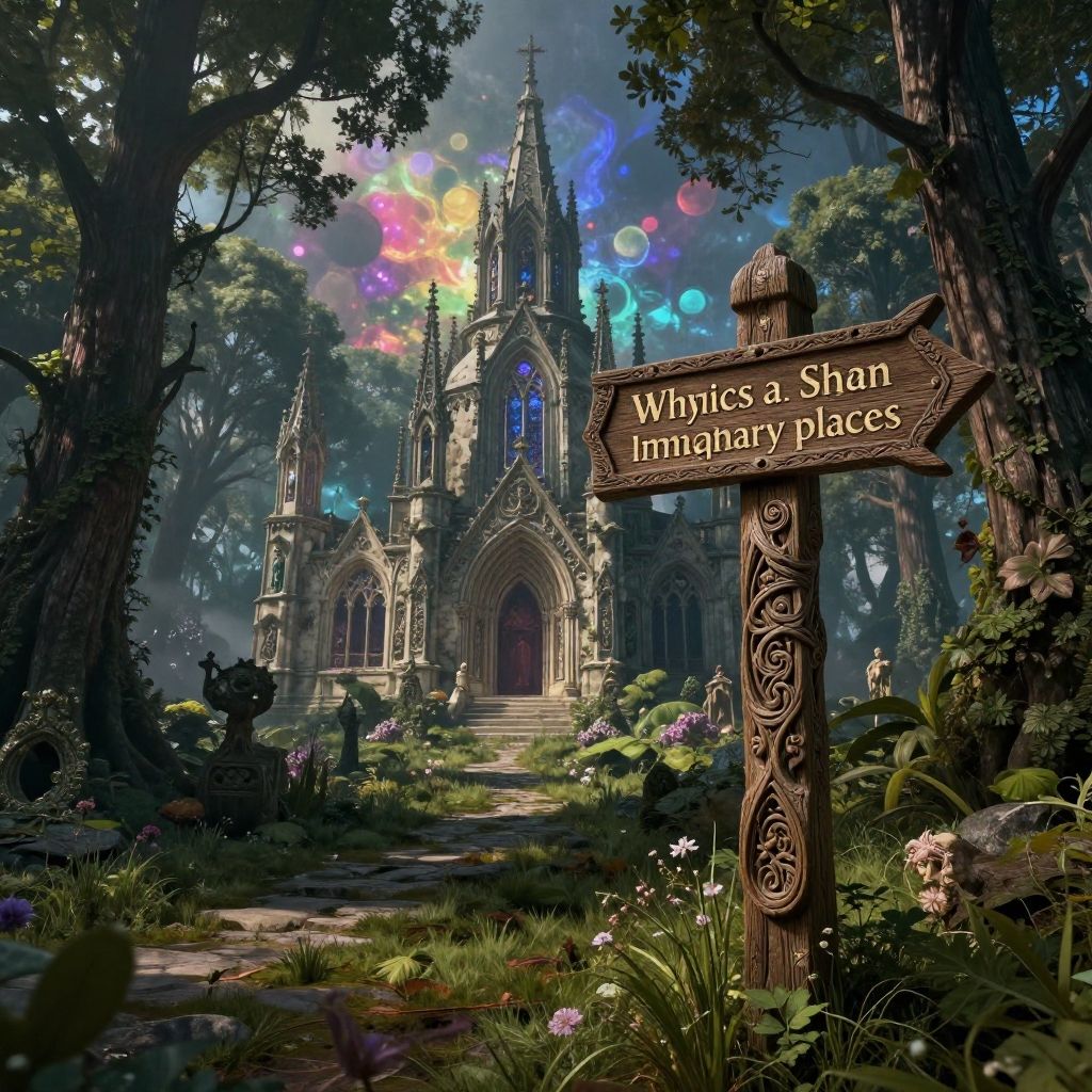 A digital fantasy artwork depicts a gothic-style church with ornate spires and stained glass windows, bathed in colorful light orbs. The church stands at the end of a moss-covered, winding path. In the foreground, a carved wooden signpost reads "Whysesa Shan Imgrany Place" amidst lush greenery and wildflowers. The scene is set in a dense, enchanted forest with towering trees and a mystical atmosphere. The church's architecture is detailed with pointed arches and intricate carvings, while the signpost features swirling patterns. The image combines realism with a whimsical, magical touch.