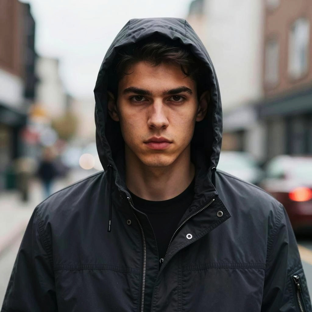 A young man wearing a dark hooded jacket faces the camera with a serious and intense expression. The urban background is softly blurred, emphasizing the subject's sharp facial features and streetwear style in this dramatic portrait.